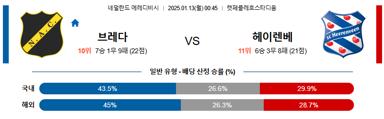 브레다 대 헤렌벤 에레디비시 01월13일 맞대결 생중계, 스포츠중계, 스포츠분석