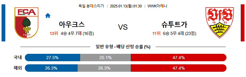아우크스부르크 대 슈투트가르트 분데스리가 01월13일 맞대결 생중계, 스포츠중계, 스포츠분석