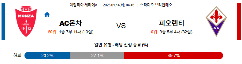 몬차 대 피오렌티나 세리에A 01월14일 맞대결 생중계, 스포츠중계, 스포츠분석