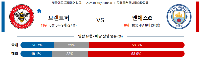 브렌트포드 대 맨체스터시티 EPL 01월15일 맞대결 생중계, 스포츠중계, 스포츠분석