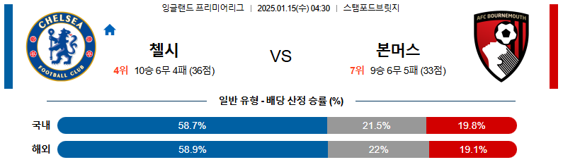 첼시 대 본머스 EPL 01월15일 맞대결 생중계, 스포츠중계, 스포츠분석
