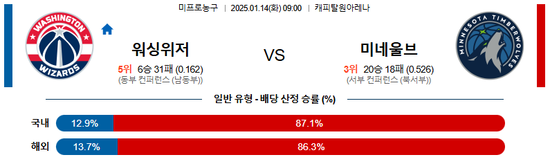 워싱턴 대 미네소타 NBA 01월14일 맞대결 생중계, 스포츠중계, 스포츠분석