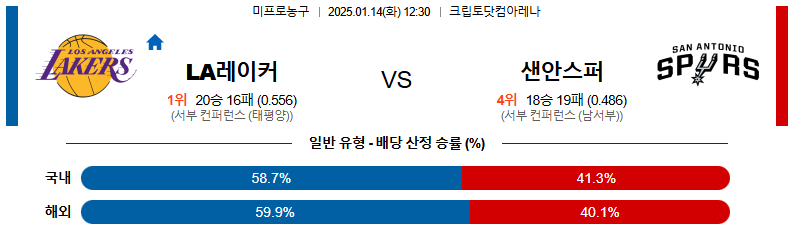 LA레이커스 대 샌안토니오 NBA 01월14일 맞대결 생중계, 스포츠중계, 스포츠분석