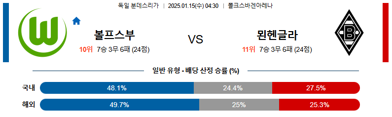 볼프스부르크 대 묀헨글라트바흐 분데스리가 01월15일 맞대결 생중계, 스포츠중계, 스포츠분석