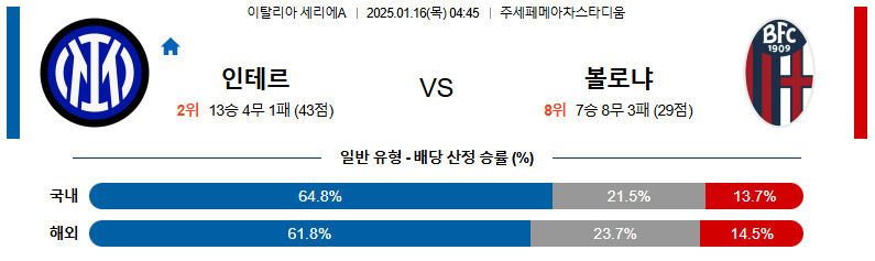 인터밀란 대 볼로냐 세리에A 01월16일 맞대결 생중계, 스포츠중계, 스포츠분석