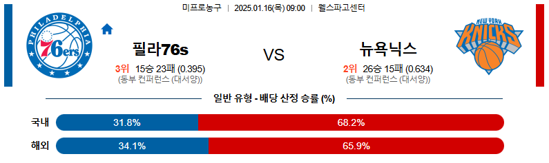 필라델피아 대 뉴욕닉스 NBA 01월16일 맞대결 생중계, 스포츠중계, 스포츠분석
