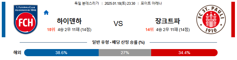 하이덴하임 대 장크트파울리 분데스리가 01월18일 맞대결 생중계, 스포츠중계, 스포츠분석