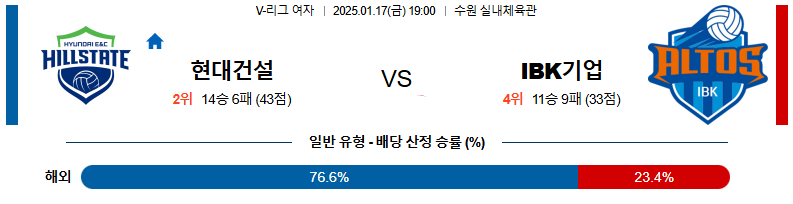 현대건설 대 IBK기업은행 V리그(여) 01월17일 맞대결 생중계, 스포츠중계, 스포츠분석