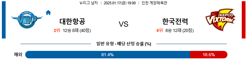 대한항공 대 한국전력 V리그 01월17일 맞대결 생중계, 스포츠중계, 스포츠분석