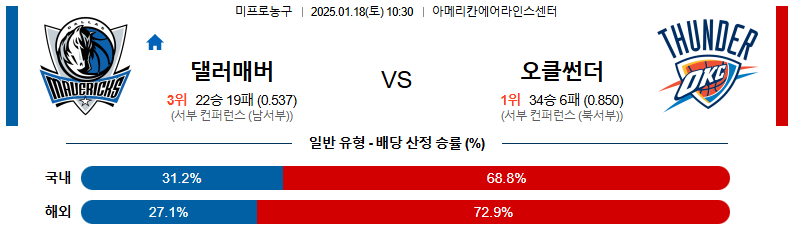 오클라호마는 주전 빅맨들이 결장하는 상황에서 스몰라인업으로 댈러스를 상대해야 합니다. 하지만 댈러스의 최근 부진과 오클라호마의 상승세를 고려할 때, 오클라호마의 승리가 유력해 보입니다.
