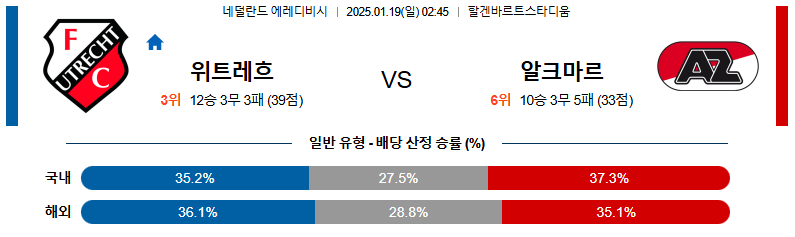 위트레흐트 대 알크마르 에데리비지에 01월19일 맞대결 생중계, 스포츠중계, 스포츠분석