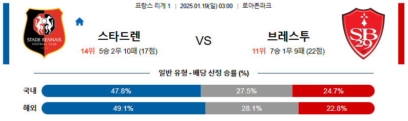 스타드렌 대 브레스트 리그앙 01월19일 맞대결 생중계, 스포츠중계, 스포츠분석