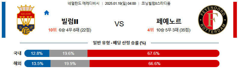 빌렘 대 페예노르트 에레디비지에 01월19일 맞대결 생중계, 스포츠중계, 스포츠분석