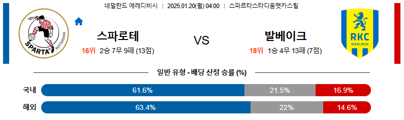 스파르타 대 발베이크 에레디비지에 01월20일 맞대결 생중계, 스포츠중계, 스포츠분석