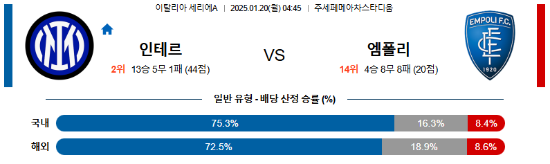 인터밀란 대 엠폴리 세리에A 01월20일 맞대결 생중계, 스포츠중계, 스포츠분석