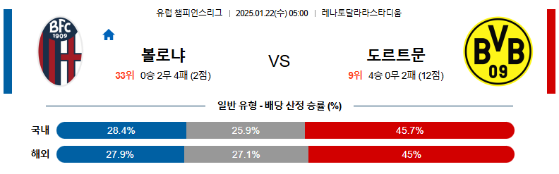 볼로냐 대 도르트문트 챔피언스리그 01월22일 맞대결 생중계, 스포츠중계, 스포츠분석