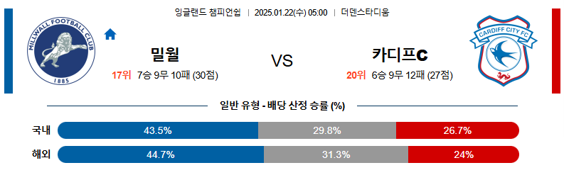 밀월 대 카디프시티 챔피언쉽 01월22일 맞대결 생중계, 스포츠중계, 스포츠분석