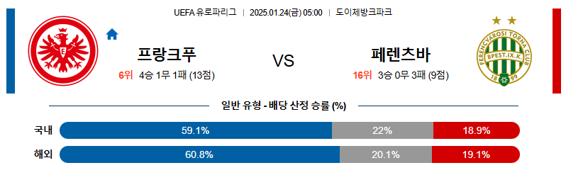 프랑크푸르트 대 페렌츠바로스 유로파리그 01월24일 맞대결 생중계, 스포츠중계, 스포츠분석