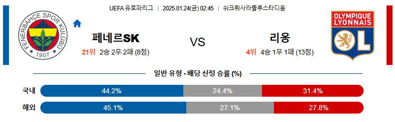 페네르바체 대 리옹 유로파리그 01월24일 맞대결 생중계, 스포츠중계, 스포츠분석