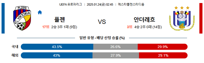 플젠 대 안더레흐트 유로파리그 01월24일 맞대결 생중계, 스포츠중계, 스포츠분석