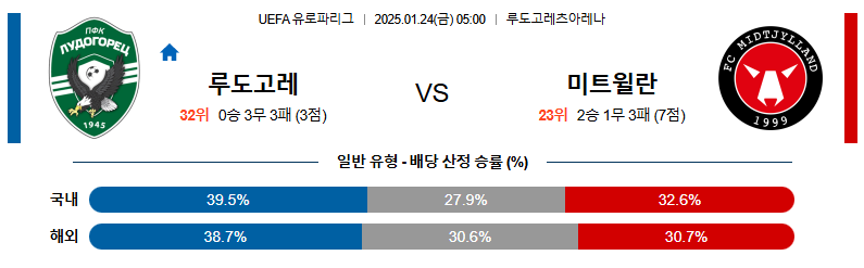 루도고레츠 대 미트윌란 유로파리그 01월24일 맞대결 생중계, 스포츠중계, 스포츠분석