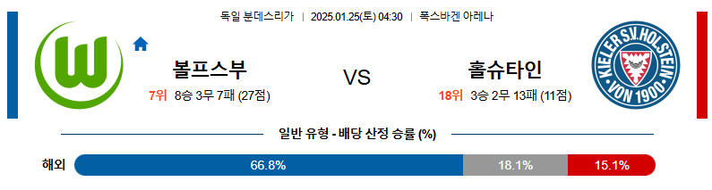 볼프스부르크 대 홀슈타인킬 분데스리가 01월25일 맞대결 생중계, 스포츠중계, 스포츠분석
