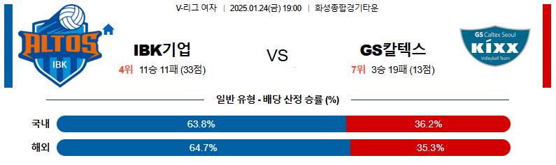 IBK기업은행 대 GS칼텍스 V리그(여) 01월24일 맞대결 생중계, 스포츠중계, 스포츠분석