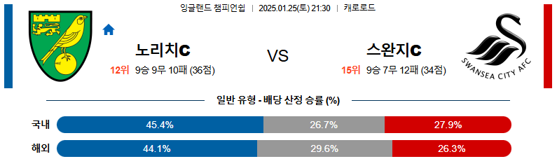 노리치시티 대 스완지시티 잉글랜드챔피언쉽 01월25일 맞대결 생중계, 스포츠중계, 스포츠분석