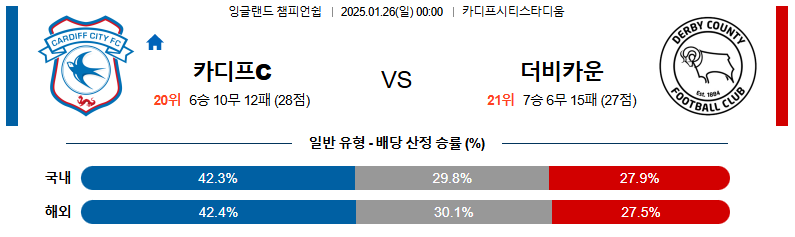 카디프시티 대 더비카운티 잉글랜드챔피언쉽 01월26일 맞대결 생중계, 스포츠중계, 스포츠분석