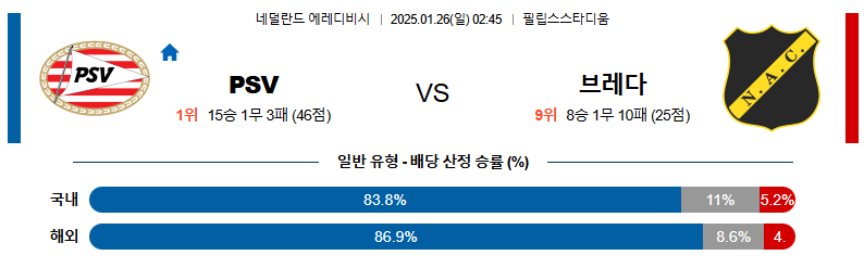 PSV 대 브레다 에레디비지에 01월26일 맞대결 생중계, 스포츠중계, 스포츠분석