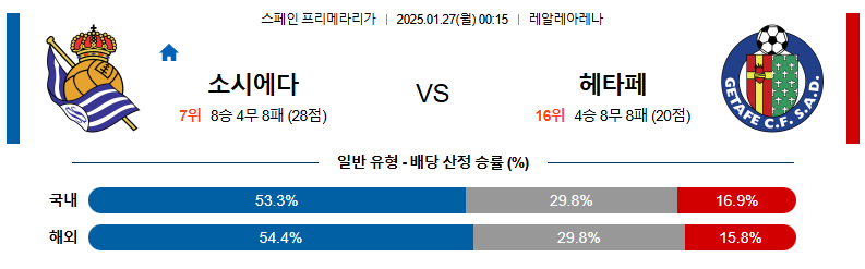 소시에다드 대 헤타페 라리가 01일27일 맞대결 생중계, 스포츠중계, 스포츠분석