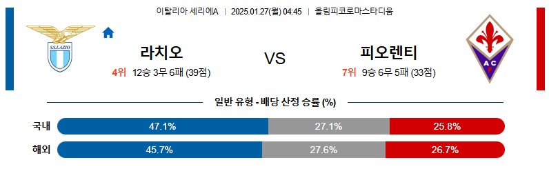 라치오 대 피오렌티나 세리에A 01일27일 맞대결 생중계, 스포츠중계, 스포츠분석