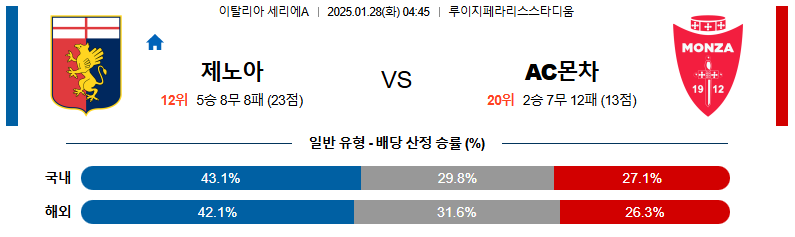 제노아 대 몬차 세리에A 01일27일 맞대결 생중계, 스포츠중계, 스포츠분석