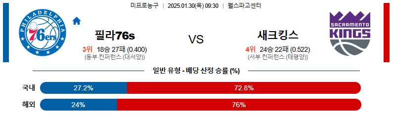 필라델피아 대 새크라멘토 NBA 01일30일 맞대결 생중계, 스포츠중계, 스포츠분석