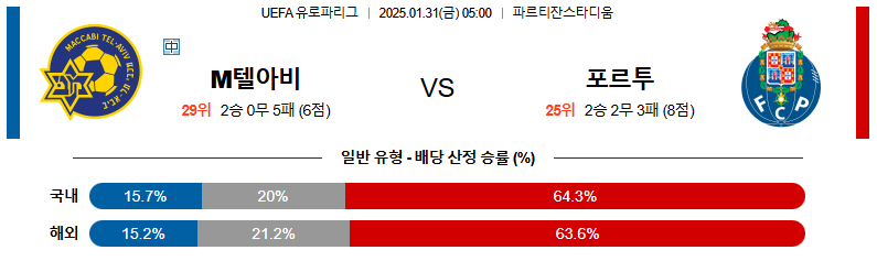 마카비 텔 아비브는 보되/글림트 원정에서 후반에 수비가 무너져 1-3으로 역전패를 당했습니다. 현재 리그 스테이지에서 29위이며, 24위 베식타시와는 승점 3점 차로 뒤처져 있는 상황입니다. 이번 최종전에서는 포르투를 반드시 이겨야 하며, 경쟁팀들이 모두 패하기를 기다려야 하는 절박한 입장입니다. 동시간대 펼쳐지는 경쟁팀들의 경기 스코어에 따라 동기부여가 저하될 수 있는 점이 우려됩니다. 다행히 기존 부상자 외에 추가 전력 누수는 없다는 소식입니다. 37세의 노장 FW 자하비는 노쇠했지만, 21세의 신성 FW 투르헤만이 새로운 주포로 자리 잡고 있다는 점은 긍정적입니다. 유로파 본선 홈경기에서 최근 5전 2승 3패로 승률이 5할 미만입니다. 참고로 이번 경기는 중동전쟁 여파로 인해 텔 아비브의 홈이 아닌 중립장소인 베오그라드(세르비아)에서 진행됩니다.