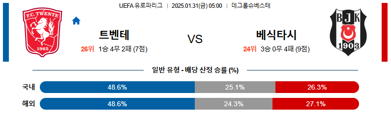베식타시는 홈에서 빌바오를 4-1로 이기며 유로파리그 플레이오프 진출 희망을 이어갔습니다. 현재 25위 포르투보다 승점 1점 앞서 있으며, 이번 최종전에서 자력으로 플레이오프 진출을 확정짓기 위해서는 반드시 3점을 노려야 합니다. 빌바오를 대파한 기세를 몰아 트벤테 원정에서도 공격적으로 나설 가능성이 높습니다. 추가 전력 누수는 없으며, 주포 임모빌레를 포함한 상당수 주전 멤버들이 벤치에서 체력을 아끼고 있다는 점도 주목할 만합니다. 임모빌레가 유로파리그에서 첫 골을 기록할 수 있을지가 이번 경기의 중요한 관건입니다. 그러나 유로파 본선 원정에서 최근 5경기 1승 4패로 취약한 모습을 보이고 있습니다.