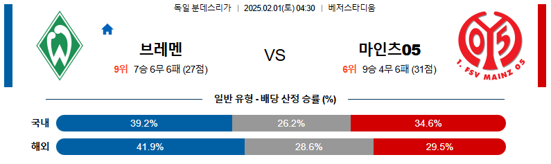 브레멘은 홈 경기에서 강한 모습을 보이고 있지만, 핵심 공격수들의 부재와 수비 불안으로 인해 마인츠의 안정적인 경기 운영을 감당하기 어려울 가능성이 큽니다. 마인츠는 최근 원정 3연패를 기록했으나, 레버쿠젠과 우니온 베를린 같은 강팀과의 경기였습니다. 이번 경기에서는 마인츠가 브레멘의 공격을 무력화하며 1-0 혹은 2-0 승리를 가져갈 가능성이 높습니다.