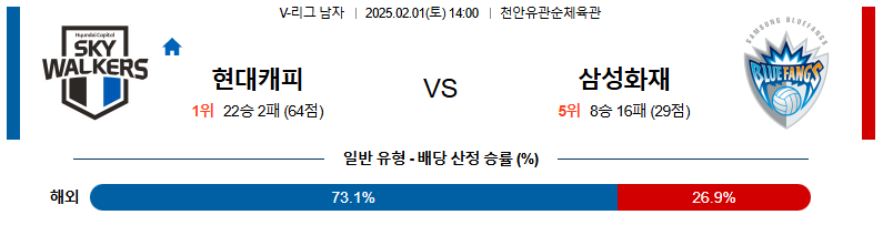 가능성이 높은 선택은 현대캐피탈의 승리이며, 배당을 노리는 선택으로는 현대캐피탈의 핸디캡 승리를 추천드립니다.