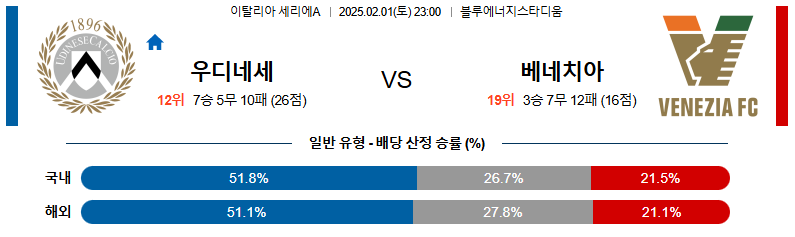 우디네세 대 베네치아 세리에A 02일01일 맞대결 생중계, 스포츠중계, 스포츠분석