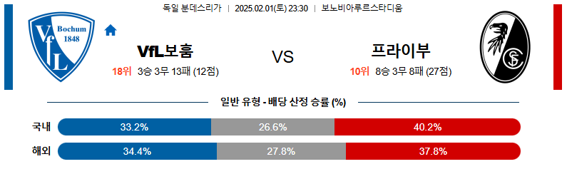 보훔 대 프라이부르크 분데스리가 02일01일 맞대결 생중계, 스포츠중계, 스포츠분석