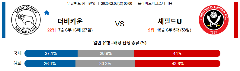 더비카운티 대 셰필드유나이티드 잉글랜드챔피언쉽 02일02일 맞대결 생중계, 스포츠중계, 스포츠분석