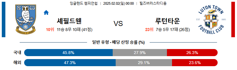 셰필드웬즈데이 대 루튼타운 잉글랜드챔피언쉽 02일02일 맞대결 생중계, 스포츠중계, 스포츠분석