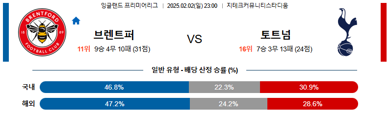 토트넘은 원정 경기에서 실점이 많으며, 패배 빈도가 높아지는 경향이 있습니다. 미키 판 더 펜이 복귀하긴 했지만, 여전히 핵심 선수들의 결장이 이어지고 있으며, 수비 조직력이 완전히 회복되지 않은 상태입니다. 게다가 주중 유로파 일정에서 주요 선수들을 기용하면서 체력적인 부담이 가중된 상태라 이번 경기에서 집중력이 흔들릴 가능성이 큽니다. 토트넘의 공격력은 여전히 위협적이지만, 브렌트포드의 홈 경기력을 감안하면 수비적으로 어려움을 겪으며 실점을 허용할 가능성이 큽니다.