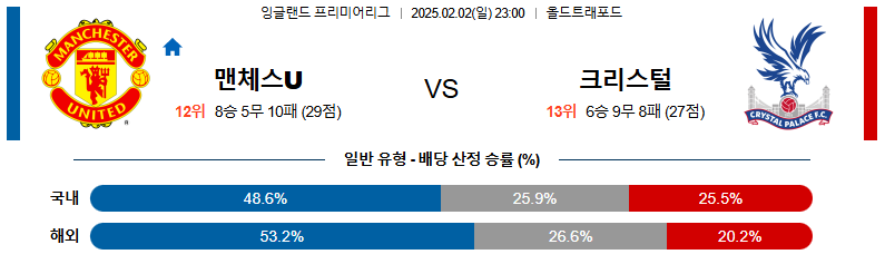 맨체스터유나이티드 대 크리스탈팰리스 EPL 02일02일 맞대결 생중계, 스포츠중계, 스포츠분석