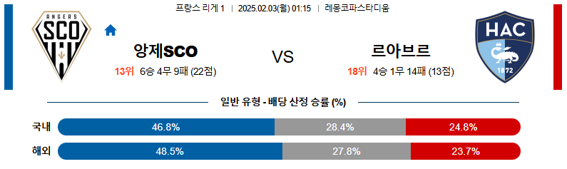 르아브르는 원정에서 평균 0.9득점에 그치며 공격적으로 다소 아쉬운 모습을 보이고 있습니다. 최근 경기에서는 득점에는 성공하고 있지만, 수비적으로 불안한 모습을 보이며 대량 실점을 허용하는 경우가 많습니다. 특히 원정 경기에서 실점 비중이 높아 상대의 강한 압박을 효과적으로 벗어나지 못하는 경우가 많았으며, 이번 경기에서도 앙제의 탄탄한 수비를 상대로 고전할 가능성이 큽니다.