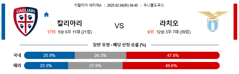 칼리아리 대 라치오 세리에A 02월04일 맞대결 생중계, 스포츠중계, 스포츠분석