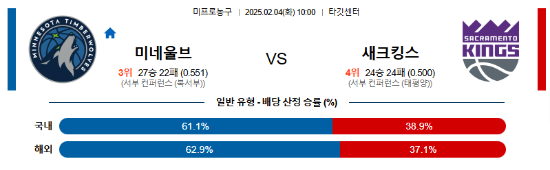 미네소타 대 새크라멘토 NBA 02월04일 맞대결 생중계, 스포츠중계, 스포츠분석