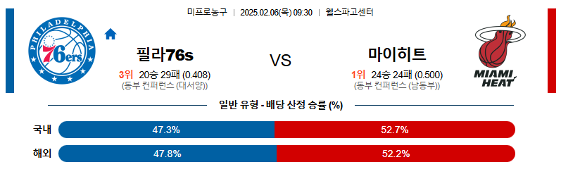 필라델피아 대 마이애미 NBA 02월06일 맞대결 생중계, 스포츠중계, 스포츠분석