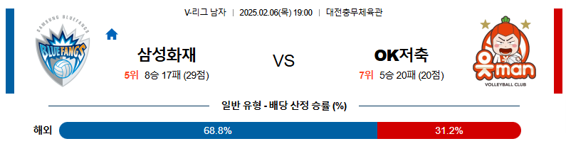 삼성화재 대 OK저축은행 V리그 02월06일 맞대결 생중계, 스포츠중계, 스포츠분석