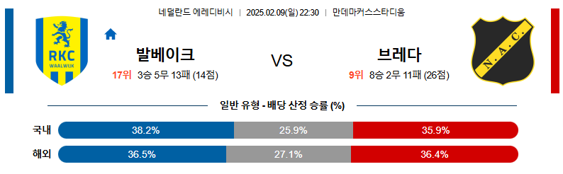 발베이크 대 브레다 에레디비지에 02월09일 맞대결 생중계, 스포츠중계, 스포츠분석